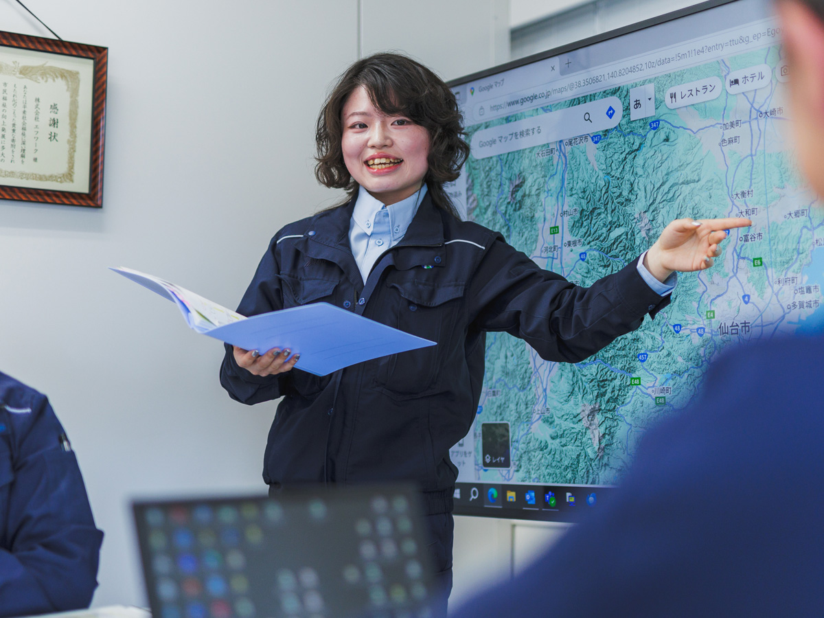 また、就職活動をする中で、工事現場で働く以外の仕事(発注者支援)がある事を知り、調べていくうちに、発注者支援は多くの工事現場に携わることができ、 復興に貢献できると感じてエフワークへの入社を決めました。